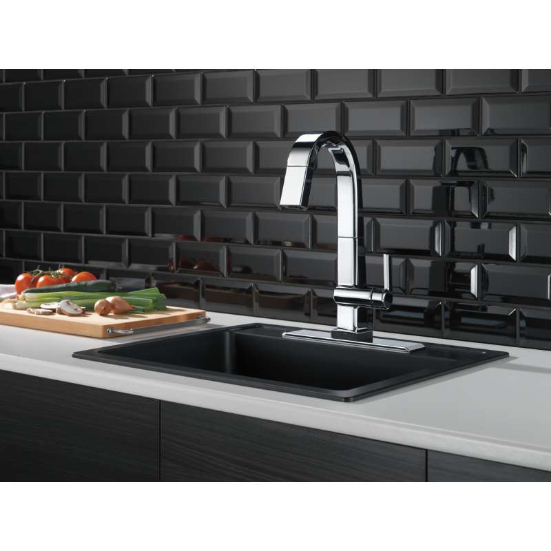 The confident slant of the Pivotal Collection makes it a striking addition to your kitchen's contemporary geometry for a look that makes a statement. Touch it on. Touch it off. Whether you have two full hands or 10 messy fingers, Delta Touch2O Technology helps keep your faucet clean, even when your hands aren't. A simple touch anywhere on the spout or handle with your wrist or forearm activates the flow of water at the temperature where your handle is set. The Delta TempSense LED light changes color to alert you to the water's temperature and eliminate any possible surprises or discomfort. Delta MagnaTite Docking uses a powerful integrated magnet to pull your faucet spray wand precisely into place and hold it there so it stays docked when not in use. Delta faucets with DIAMOND Seal Technology perform like new for life with a patented design which reduces leak points, is less hassle to install and lasts twice as long as the industry standard. You can install with confidence, knowing that Delta faucets are backed by our Lifetime Limited Warranty. Electronic parts are backed by our 5-year electronic parts warranty. Industry standard is based on ASME A112.18.1 of 500,000 cycles.
