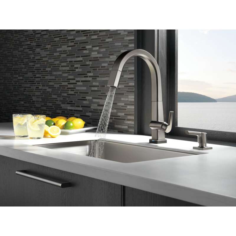 The confident slant of the Pivotal Collection makes it a striking addition to your kitchen's contemporary geometry for a look that makes a statement. Clear the clutter from around your sink with this Delta Soap Dispenser. This soap dispenser may also be used with lotion. Easily refillable from above the deck, the bottle holds 13 oz. of liquid. Pump assembly and bottle are included.