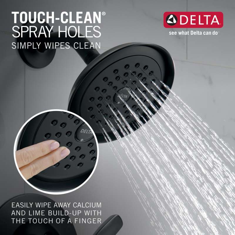 • Soft, rubber touch-clean spray holes allow you to easily wipe away calcium and lime buildup from the spray face of your shower head and hand shower with the touch of a finger.