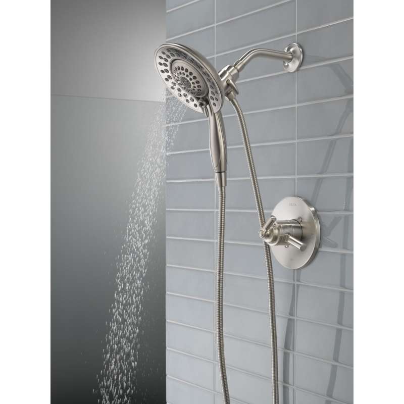 The saylor bath collection is an intriguing blend of traditional and contemporary design elements with strong, geometric forms and hints of industrial style in the handles. The delta in2ition two-in-one shower features a detachable hand shower which can be used separately from or simultaneously with the shower head. This integrated dual-functionality gives you maximum flexibility without sacrificing warmth, as you can choose to have water streaming from the shower head only, the hand shower only or both the shower head and hand shower at once. With separate handles for volume and temperature control, this delta tub/shower provides a more refined showering experience. Simply set the water at your preferred temperature and turn the shower on or off with the volume control handle—without interrupting your set temperature. Delta showers with monitor pressure-balance valves are engineered to make sure you don’t experience a sudden and possibly unsafe change in water temperature as a result of running water elsewhere, such as using a dishwasher, flushing a toilet or running a washing machine. While other products may gather unsightly mineral buildup over time, delta soft rubber touch-clean spray holes allow any mineral residue to simply be wiped away for an instantly refreshed look — with no need for soaking or the aid of chemical cleaners. The pause setting gives you ample space for shaving, lathering and other shower tasks, then easily restarts the water with the temperature where you left off. This spray setting helps you conserve water, so you can worry less about depleting your supply of hot water — and you help the environment too. Delta watersense labeled faucets, showers and toilets use at least 20% less water than the industry standard — helping you save water without compromising performance. You can install with confidence, knowing delta products are backed by our lifetime limited warranty.