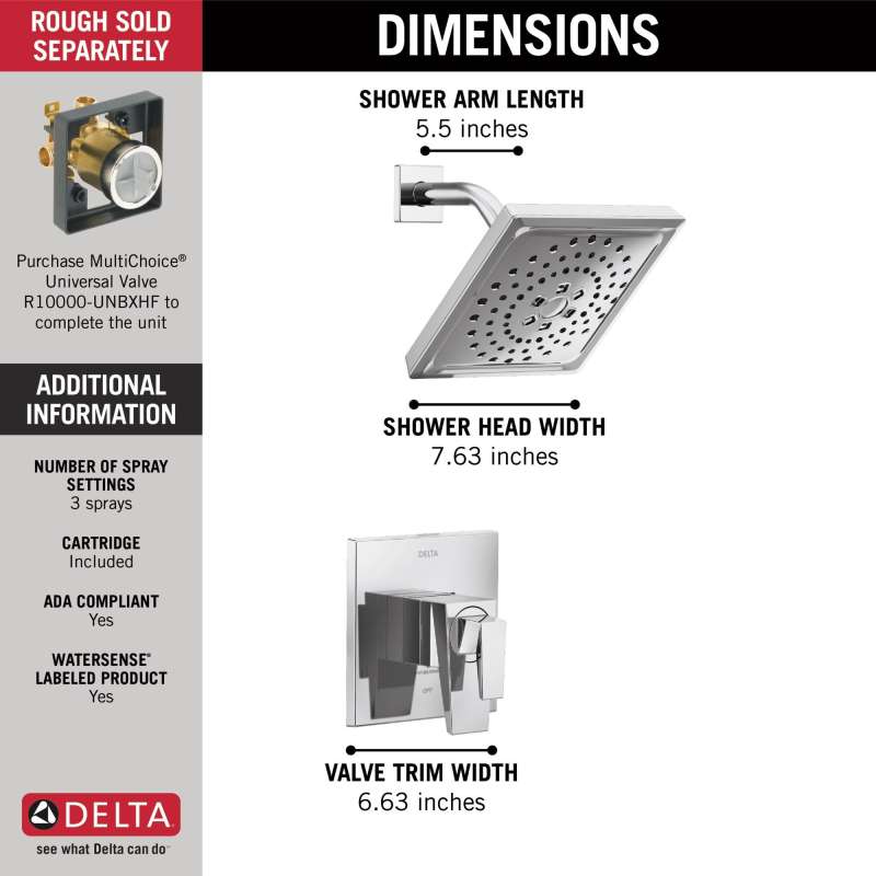 The prismatic faceting of the trillian bath collection is an evolution of modern style that creates an edgy look which catches the light as well as the eye. Delta showers with monitor pressure-balance valves are engineered to make sure you don’t experience a sudden and possibly unsafe change in water temperature as a result of running water elsewhere, such as using a dishwasher, flushing a toilet or running a washing machine. With separate handles for volume and temperature control, this delta shower provides a more refined showering experience. Simply set the water at your preferred temperature and turn the shower on or off with the volume control handle — without interrupting your set temperature. You can install with confidence, knowing that delta showers are backed by our lifetime limited warranty.