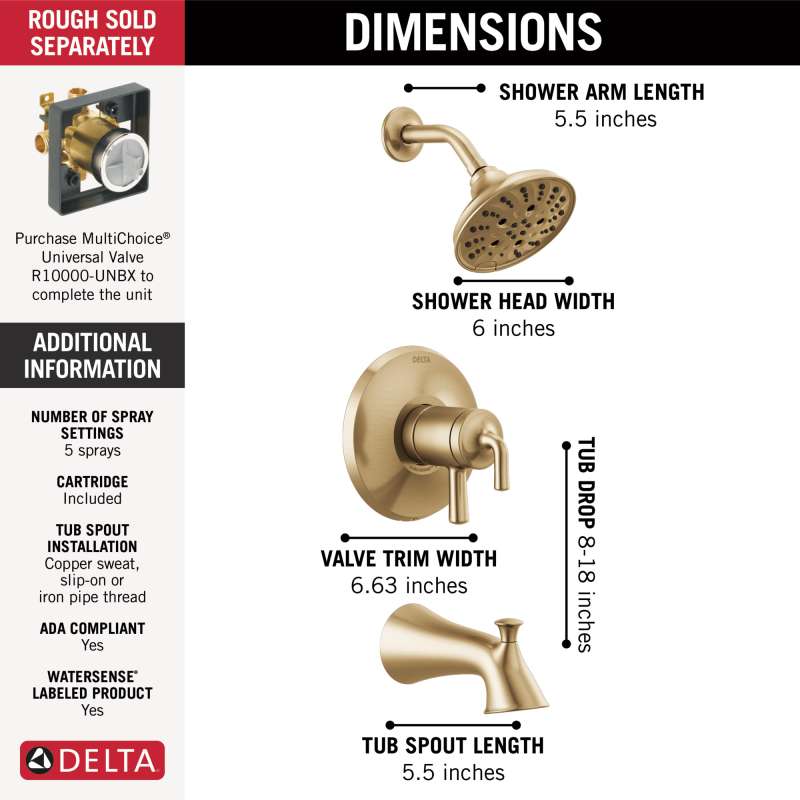 The stretched feminine form and unbroken lines of the Kayra Bath Collection create a clean, flowing design. With separate handles for volume and temperature control, this Delta tub/shower faucet provides a more refined showering experience. Simply set the water at your preferred temperature and turn the shower on or off with the volume control handle - without interrupting your set temperature. The pause setting gives you ample space for shaving, lathering and other shower tasks, then easily restarts the water with the temperature where you left off. This spray setting helps you conserve water, so you can worry less about depleting your supply of hot water - and you help the environment too. Delta pressure-balance valves use Monitor Technology to protect you and your family from sudden temperature changes. Delta WaterSense labeled faucets, showers and toilets use at least 20% less water than the industry standard—saving you money without compromising performance. You can install with confidence, knowing that Delta faucets are backed by our Lifetime Limited Warranty.