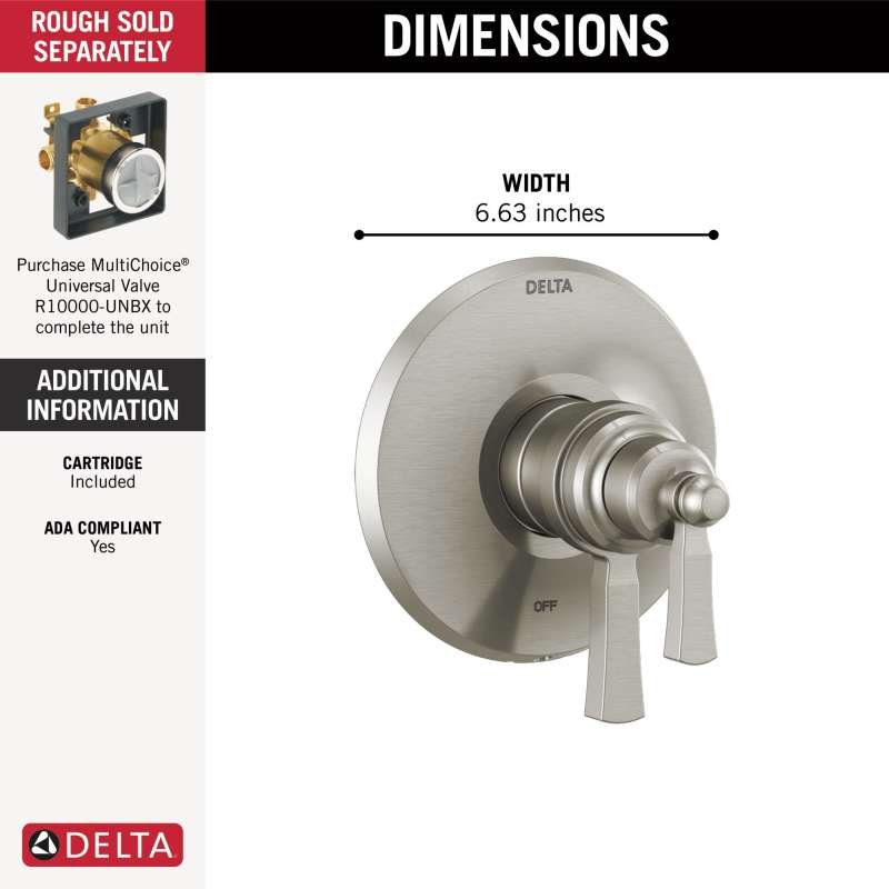 The dorval bathroom collection diverges from conventional expectations with regal accents and a powerful design that commands your attention. Inspired by the feminine lines of french architecture and the regal stature of german castles, the dorval bath collection balances grace and power in this modern take on new traditional design. With separate handles for volume and temperature control, this delta tub/shower provides a more refined showering experience. Simply set the water at your preferred temperature and turn the shower on or off with the volume control handle - without interrupting your set temperature. Delta thermostatic valves use tempassure technology to protect you and your family from sudden temperature changes. Delta pressure-balance valves use monitor technology to protect you and your family from sudden temperature changes.