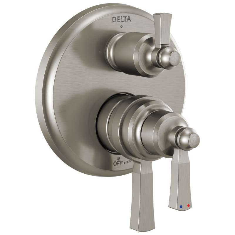 The dorval bathroom collection diverges from conventional expectations with regal accents and a powerful design that commands your attention. Inspired by the feminine lines of french architecture and the regal stature of german castles, the dorval bath collection balances grace and power in this modern take on new traditional design. With separate handles for volume and temperature control, this delta tub/shower provides a more refined showering experience. Simply set the water at your preferred temperature and turn the shower on or off with the volume control handle - without interrupting your set temperature. Delta pressure-balance valves use monitor technology to protect you and your family from sudden temperature changes.