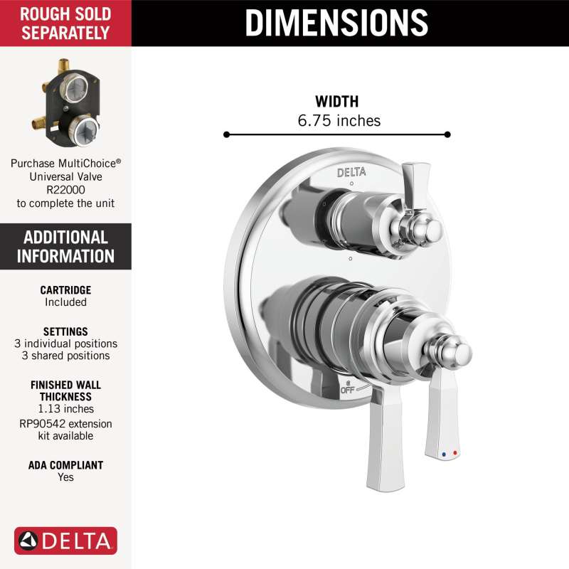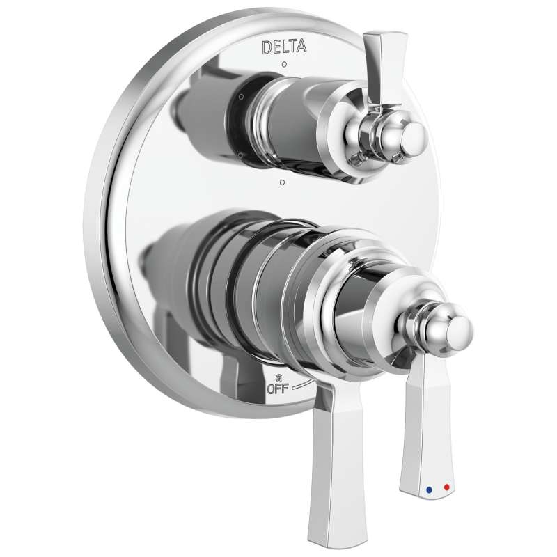 The dorval bathroom collection diverges from conventional expectations with regal accents and a powerful design that commands your attention. Inspired by the feminine lines of french architecture and the regal stature of german castles, the dorval bath collection balances grace and power in this modern take on new traditional design. With separate handles for volume and temperature control, this delta tub/shower provides a more refined showering experience. Simply set the water at your preferred temperature and turn the shower on or off with the volume control handle - without interrupting your set temperature. Delta pressure-balance valves use monitor technology to protect you and your family from sudden temperature changes.