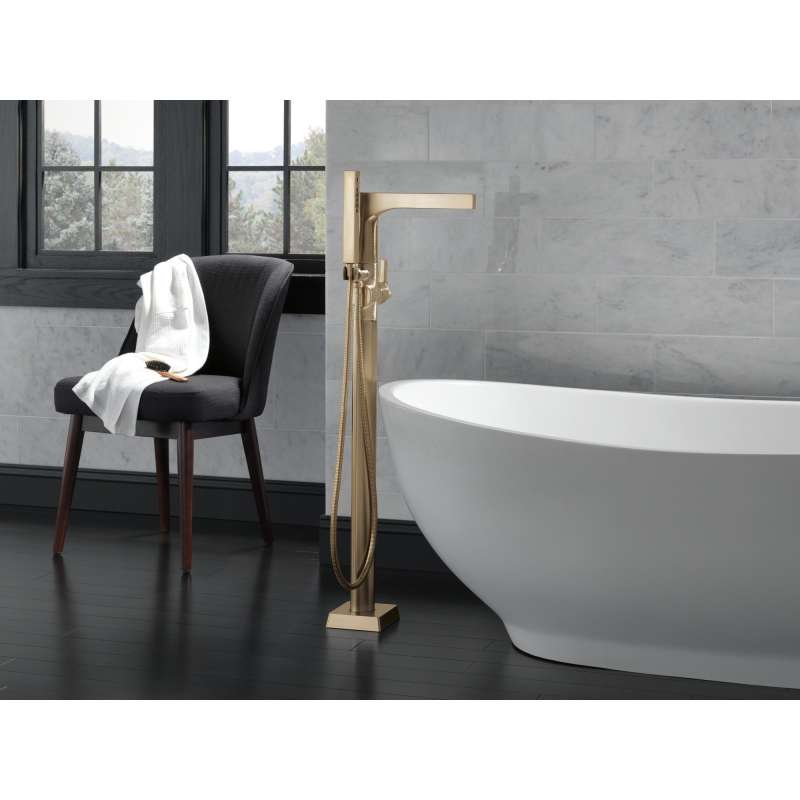 Complete your bath with a beautifully designed Delta roman tub faucet, meticulously crafted to turn heads and enhance your experience. The included hand shower makes this a versatile addition to your bath, perfect for rinsing off, washing loved ones and pets or keeping your tub clean. Delta H2Okinetic Hand Showers look different because they are different. Using advanced technology, H2Okinetic Hand Showers sculpt water into a unique wave pattern, giving you 3X the coverage of a standard shower head. The end result is a hand shower that provides more coverage, more warmth and more intensity for a truly drenching experience. Designed to look like new for life, Brilliance finishes are developed using a proprietary process that creates a durable, long-lasting finish that is guaranteed not to corrode, tarnish or discolor. Take the chill out of contemporary with the eloquent warmth of Champagne Bronze in your bath. This vibrant, gold finish provides a vivid splash of contrast to your space for a look that's simultaneously modern and nimble, able to pair elegantly with traditional, transitional, and contemporary décor. You can install with confidence, knowing that Delta faucets are backed by our Lifetime Limited Warranty. Coverage measured in accordance with EPA WaterSense Specification for shower heads, March 4, 2010.
