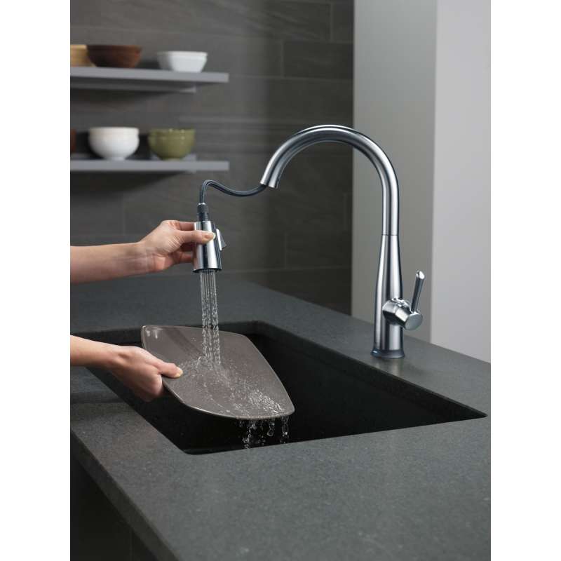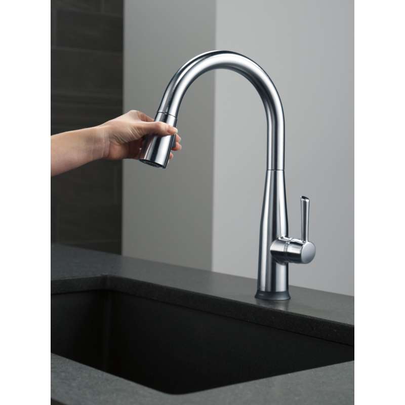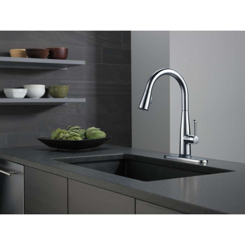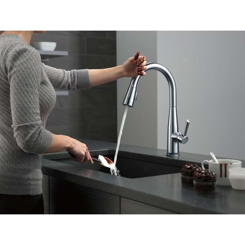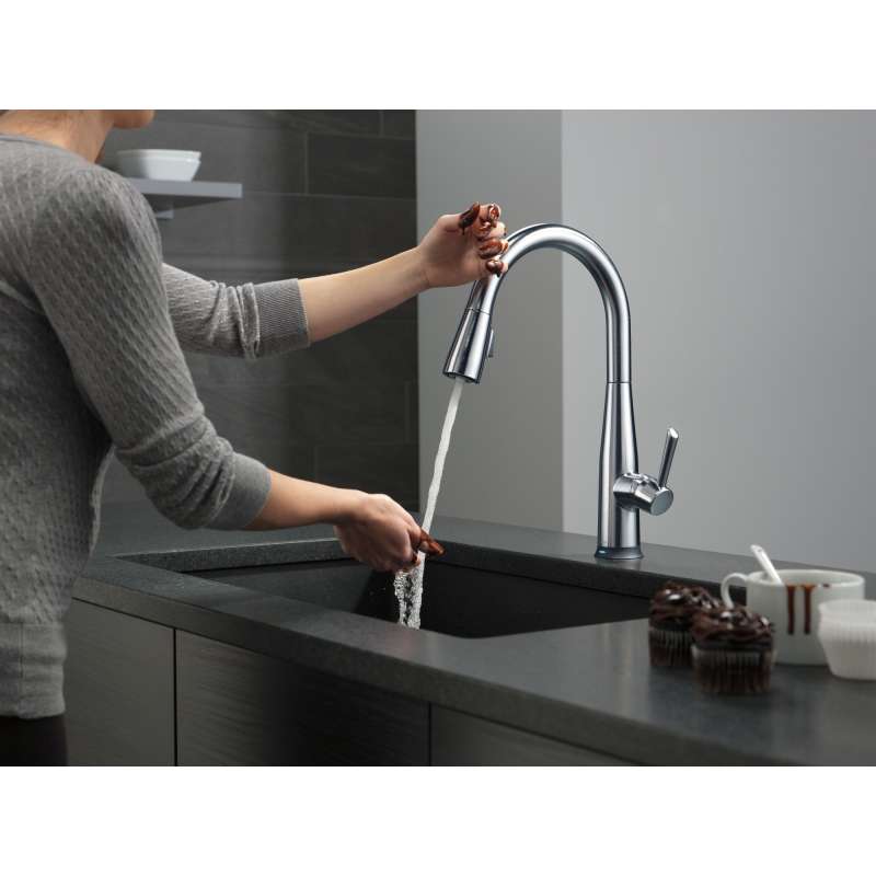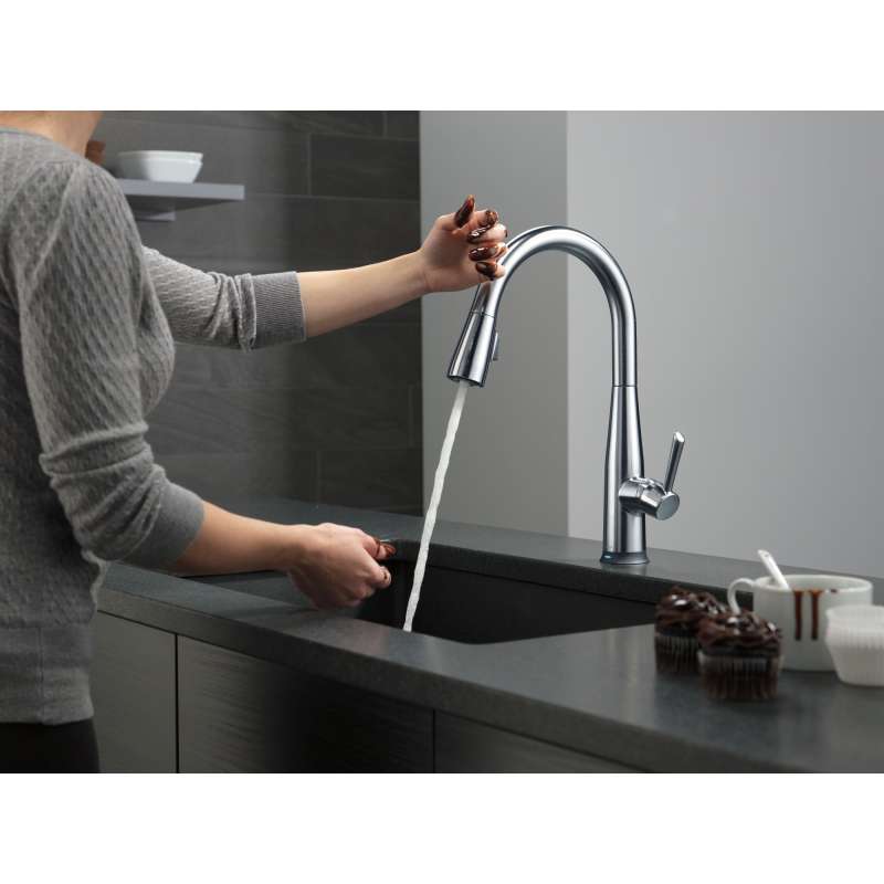 Delta voiceiq technology pairs with your connected home device to give you exactly the amount of water you need with features like metered dispensing and custom container commands. Simply ask your faucet to dispense one cup, six ounces, a gallon or just about any other amount you could need. Custom container commands make everyday tasks easier, like filling a coffee pot or dog bowl, while thoughtful features like water warm-up and voice-activated on/off lend a hand when yours are full. Take command of your kitchen with a voiceiq faucet: a revolutionary kitchen faucet that thinks on demand. This essa pull-down kitchen faucet is packed with functional features, like delta touch2o technology. A simple touch anywhere on the spout or handle with your wrist or forearm activates the flow of water at the temperature where your handle is set. The delta tempsense led light changes color to alert you to the water’s temperature and eliminates any possible surprises or discomfort. Kitchen sink faucets with touch-clean spray holes allow you to easily wipe away calcium and lime build-up with the touch of a finger. Delta kitchen faucets with diamond seal technology perform like new for life with a patented design which reduces leak points, is less hassle to install and lasts twice as long as the industry standard. Kitchen sink faucets with touch-clean spray holes allow you to easily wipe away calcium and lime build-up with the touch of a finger. You can install with confidence, knowing that delta kitchen faucets are backed by our lifetime limited warranty. Electronic parts are backed by our 5-year electronic parts warranty. Industry standard is based on asme a112.18.1 of 500,000 cycles.