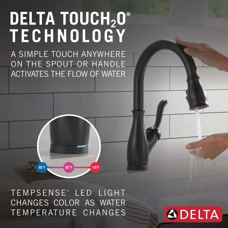 Touch it on. Touch it off. Whether you have two full hands or 10 messy fingers, delta touch2o technology helps keep your faucet clean, even when your hands aren’t. A simple touch anywhere on the spout or handle with your wrist or forearm activates the flow of water at the temperature where your handle is set. The delta tempsense led light changes color to alert you to the water’s temperature and eliminate any possible surprises or discomfort. Delta magnatite docking uses a powerful integrated magnet to pull your faucet spray wand precisely into place and hold it there so it stays docked when not in use. Delta shieldspray technology cleans with laser-like precision while containing mess and splatter. A concentrated jet powers away stubborn messes while an innovative shield of water contains splatter and clears off the mess, so you can spend less time soaking, scrubbing and shirt swapping. Delta faucets with diamond seal technology perform like new for life with a patented design which reduces leak points, is less hassle to install and lasts twice as long as the industry standard. Kitchen faucets with touch-clean spray holes allow you to easily wipe away calcium and lime build-up with the touch of a finger. You can install with confidence, knowing that delta faucets are backed by our lifetime limited warranty. Electronic parts are backed by our 5-year electronic parts warranty. Industry standard is based on asme a112.18.1 of 500,000 cycles.