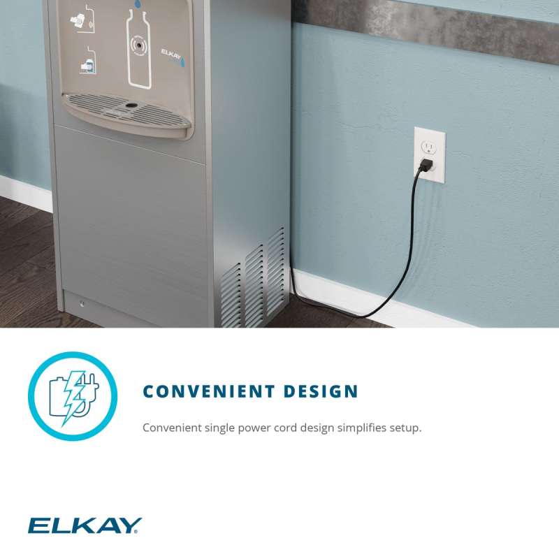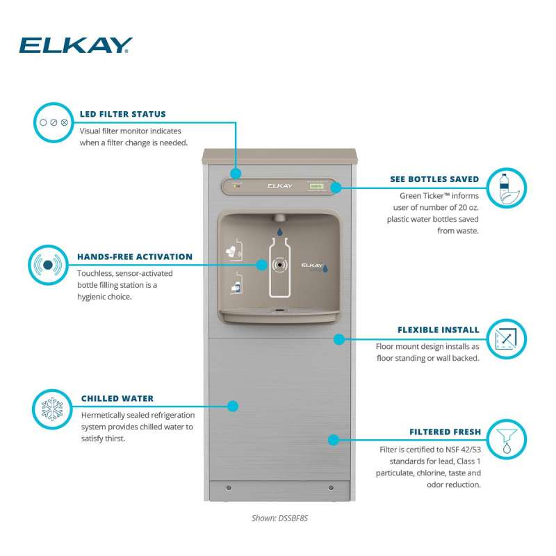 The Elkay ezH2O smart connected, floor standing filtered bottle filling station delivers a clean, quick water bottle fill and enhances sustainability by minimizing dependency on disposable plastic bottles. Can be installed in any indoor location where there is a water supply and drain. Sanitary no-touch sensor activation features an automatic 20-second shut-off timer.