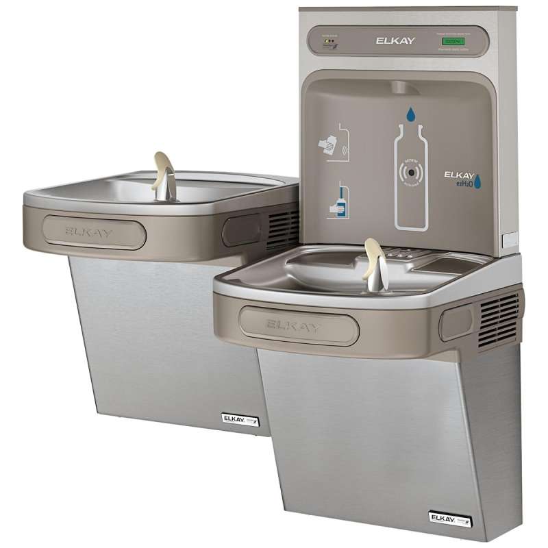 The Elkay EZH2O Bottle Filling Station delivers a clean quick water bottle fill and enhances sustainability by minimizing our dependency on disposable plastic bottles. Complete cooler and bottle filling station in a consolidated space saving ADA compliant design. NEW Versatile Bi-Level cooler design allows for standard cooler installation of high-left/low-right or the alternate reverse cooler installation.