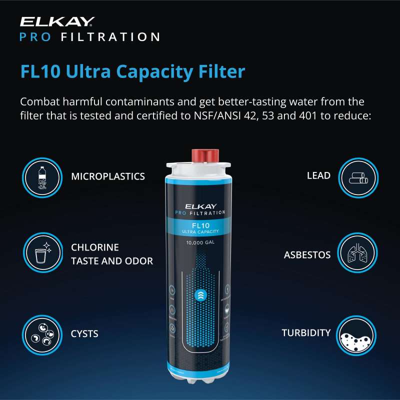 This dual pack pairs the Elkay FSR5 Sediment Pre-Filter with the Elkay FL10 Ultra-Capacity Lead + Microplastics 10,000 gal. filter to enhance your Elkay Pro Filtration bottle filling station. Together, they reduce sediment buildup, combat harmful contaminants and deliver cleaner, better-tasting water.