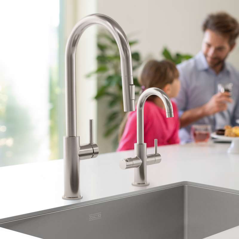 Simplify your daily life with authentic Italian craftsmanship with the Maris Lario Kitchen Faucet. This collection combines sophistication with durability to enhance any kitchen aesthetic. Its tall pull-down spout with a spray function makes rinsing and cleaning large pots and pans effortless. A premium laminar aerator ensures a crystal-clear, non-splashing stream with minimal noise, delivering a smooth and quiet experience every time. This faucet is part of the complete Maris Lario collection, which includes kitchen, prep, bar, pot filler, and filtration faucets, all designed to integrate seamlessly and complement other Franke products, ensuring a harmonious aesthetic throughout the home.