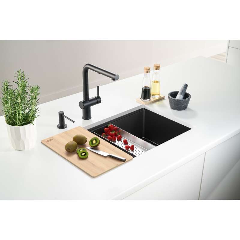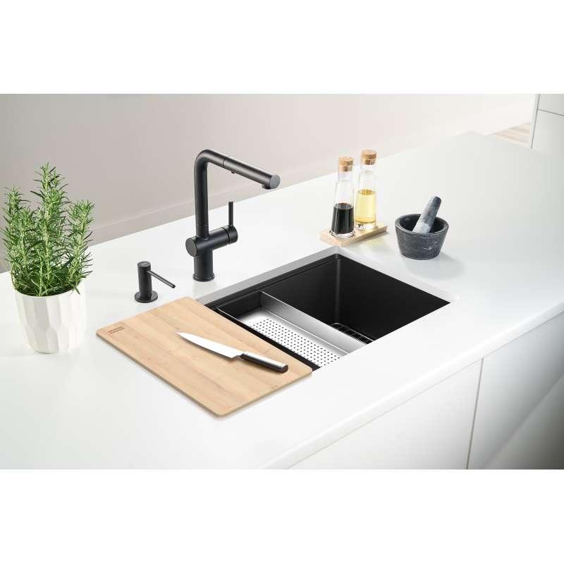 The Maris single bowl Fragranite Workstation Sink combines sleek design with unbeatable functionality. Made from a durable blend of 20% resin and 80% natural quartz, this sink is resistant to heat, scratches, and stains while naturally inhibiting bacteria growth for a hygienic kitchen. The integrated workstation design includes a bottom grid, colander, and cutting board, providing a versatile space for meal prep, rinsing, and draining. With its stylish appearance and practical features, the Maris Fragranite Workstation Sink is the perfect solution for busy kitchens, making daily tasks more efficient and organized