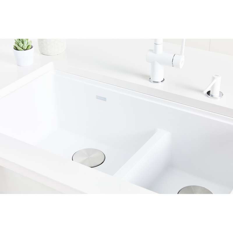 Say goodbye to choosing between design and function with this versatile sink that maximizes your kitchen space for a variety of tasks. The double bowl design allows you to effortlessly multitask, while the low divide creates a larger single bowl that's perfect for cleaning oversized cookware and bakeware. Crafted from a blend of 20% resin and 80% natural quartz, Franke Fragranite is a durable material designed to withstand the demands of busy family homes. With its non-porous surface that resists heat and scratches, it naturally inhibits bacteria growth, ensuring your kitchen stays fresh and hygienic.