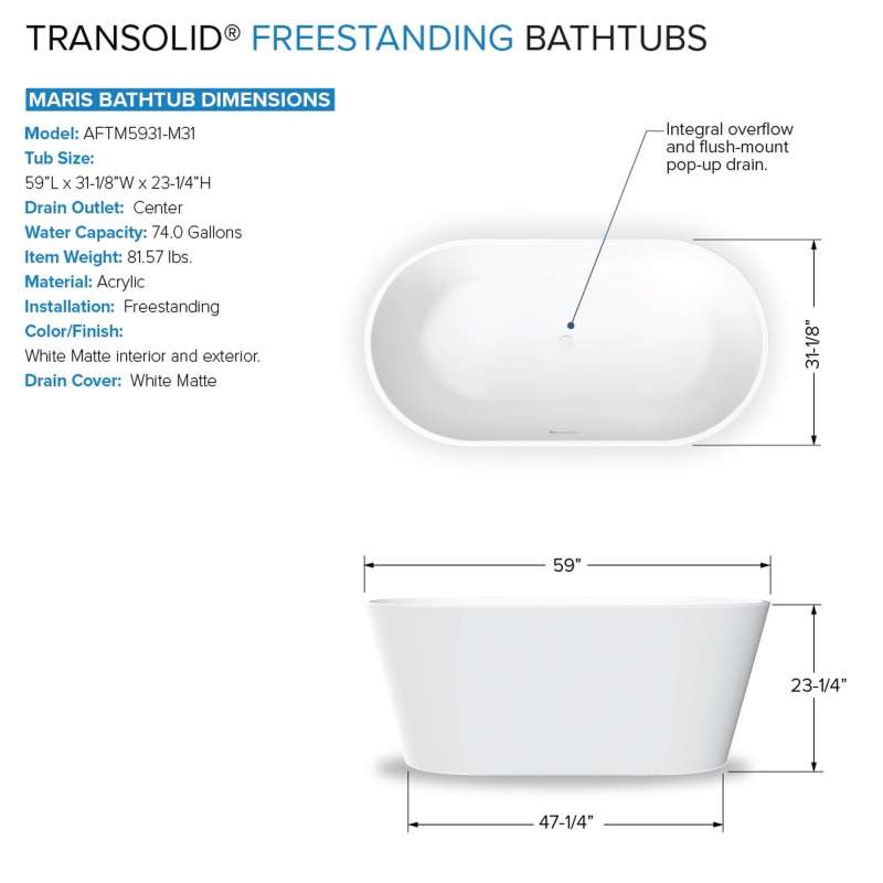 Indulge in luxurious bathing with Transolid's freestanding acrylic bathtub kit. This 59-in matte white tub with pop-up drain and integrated overflow includes a self-adhering bath pillow. Crafted for durability and easy maintenance, Transolid acrylic bathtubs bring modern elegance and comfort to any space.