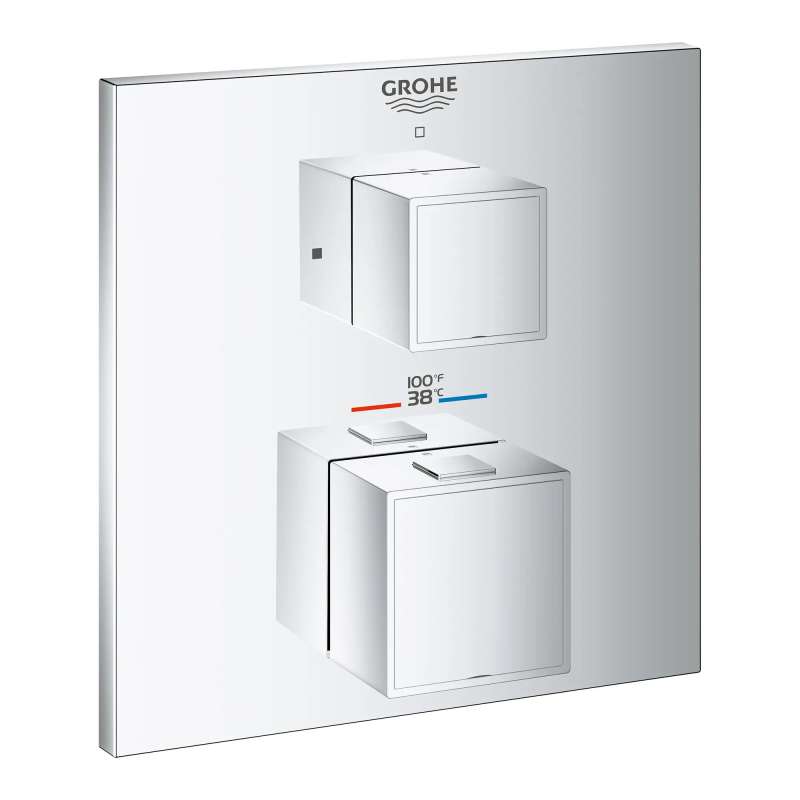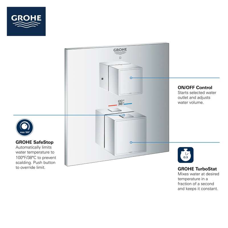 From its artful cube profile to its intuitive operation, the GROHE Grohtherm Cube Single Function 2-Handle Thermostatic Trim with Control Module lends clean, geometric lines to a contemporary bathroom. Thoughtfully designed for comfort and enjoyment, Grohtherm features an upper handle to control volume and on/off, a lower handle to control temperature, GROHE Turbostat to maintain consistent temperature, and GROHE SafeStop to prevent scalding. It's the perfect combination of style and substance in today's home.