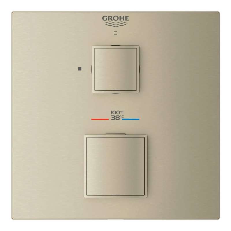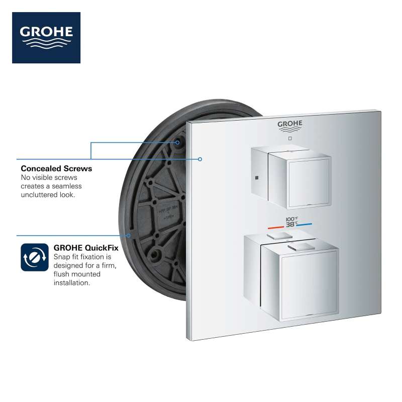 From its artful cube profile to its intuitive operation, the GROHE Grohtherm Cube Single Function 2-Handle Thermostatic Trim with Control Module lends clean, geometric lines to a contemporary bathroom. Thoughtfully designed for comfort and enjoyment, Grohtherm features an upper handle to control volume and on/off, a lower handle to control temperature, GROHE Turbostat to maintain consistent temperature, and GROHE SafeStop to prevent scalding. It's the perfect combination of style and substance in today's home.