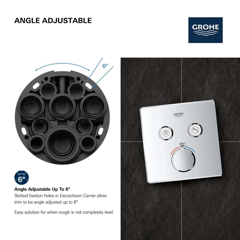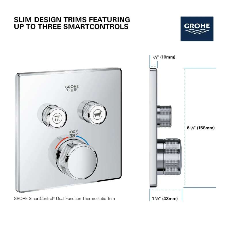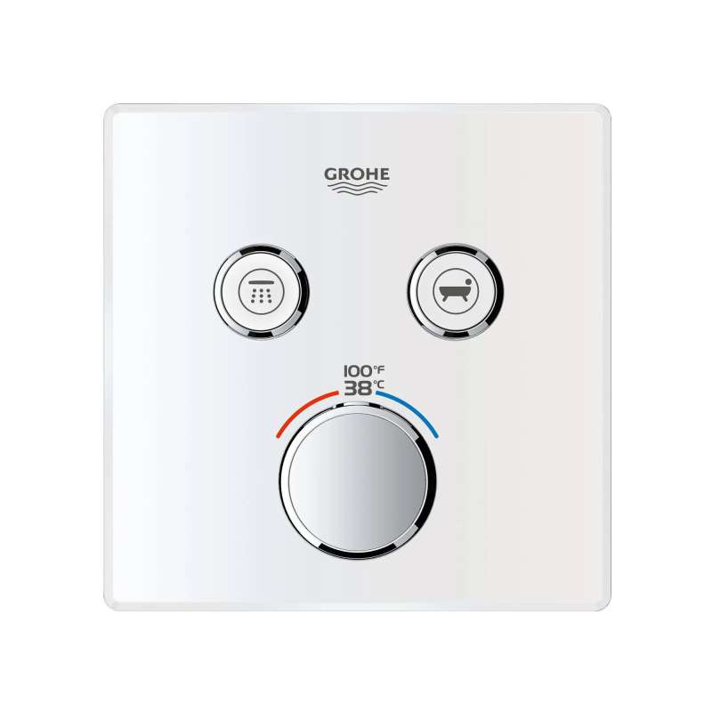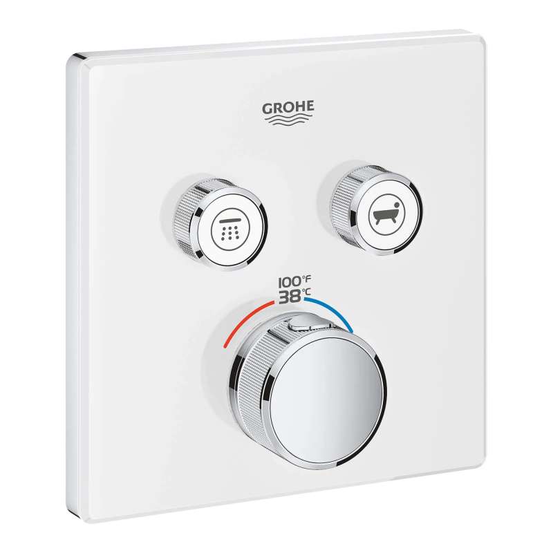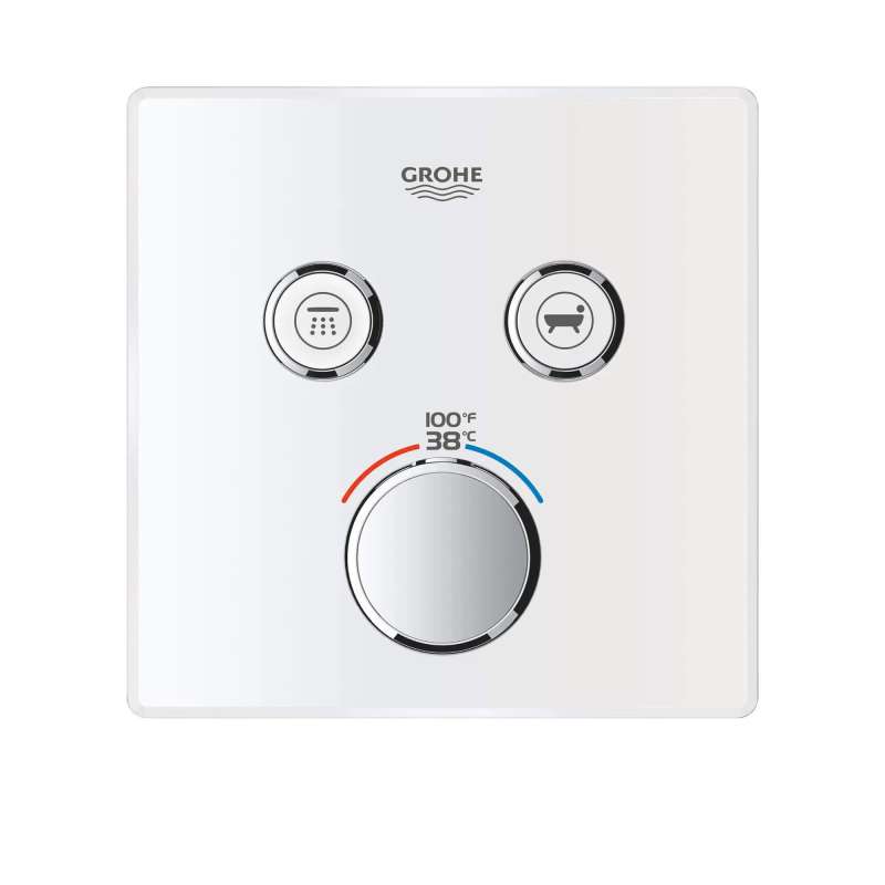 Grohtherm SmartControl - break the mold with this chic, slim thermostat offering total flexibility Choose a thermostat that is as flexible as possible for your most enjoyable shower or bath ever. Packed with useful features, the Grohtherm SmartControl concealed thermostat features a minimalist design and stylish Moon White that will enhance any modern bathroom. The innovative SmartControl technology allows you to select your desired spray source and adjust the water volume at the push-turn of a button. The three valves offer total flexibility, whatever your shower set up - you can control, switch between or even combine different spray patterns and water outlets - perfect for spaces where you want to have hand, head and side showers, as well as a bath. Integrated GROHE Turbostat technology prevents any unpleasant temperature fluctuations. GROHE EasyLogic markings and textured buttons with exchangeable symbols make it easy and intuitive to use. Family-friendly, the GROHE SafeStop override button allows you to set a maximum temperature of 100 deg F/38 deg C to prevent scalding. Water-saving GROHE EcoJoy technology gives you the option of a reduced flow rate with no compromise on enjoyment. Thanks to the GROHE QuickFix system it's Swift and straightforward to install. The slim profile makes it easy to keep clean, and the chic, durable GROHE StarLight Moon finish will look pristine for years to come. With a slim, round design perfect for that minimalist, streamlined look, this product is bound to enhance your bathroom scheme. Please note that this product must be installed in combination with the GROHE Rapido SmartBox (35601000).