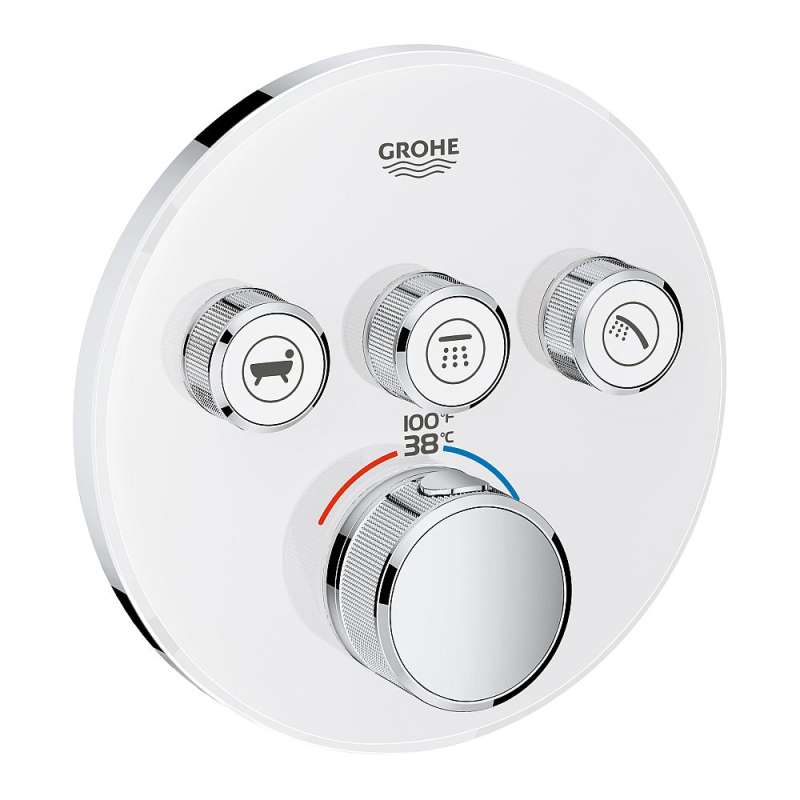 Grohtherm SmartControl break the mould with this chic, slim thermostat offering total flexibility. Choose a thermostat that is as flexible as possible for your most enjoyable shower or bath ever. Packed with useful features, the Grohtherm SmartControl concealed thermostat features a minimalist design and stylish Moon White that will enhance any modern bathroom. The innovative SmartControl technology allows you to select your desired spray source and adjust the water volume at the push-turn of a button. The three valves offer total flexibility, whatever your shower set up you can control, switch between or even combine different spray patterns and water outlets perfect for spaces where you want to have hand, head and side showers, as well as a bath. Integrated GROHE TurboStat technology prevents any unpleasant temperature fluctuations. GROHE EasyLogic markings and textured buttons with exchangeable symbols make it easy and intuitive to use. Family-friendly, the GROHE SafeStop override button allows you to set a maximum temperature of 100 degree F to prevent scalding. Water-saving GROHE EcoJoy technology gives you the option of a reduced flow rate with no compromise on enjoyment. Thanks to the GROHE QuickFix system it's swift and straightforward to install. The slim profile makes it easy to keep clean, and the chic, durable GROHE StarLight Moon finish will look pristine for years to come. With a slim, round design perfect for that minimalist, streamlined look, this product is bound to enhance your bathroom scheme. Please note that this product must be installed in combination with the GROHE Rapido SmartBox (35601000).