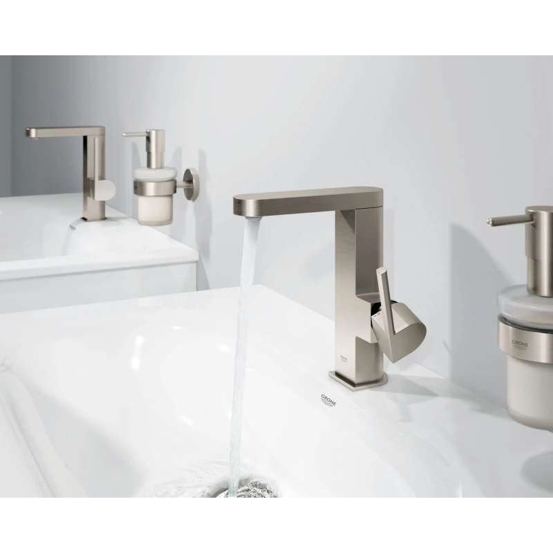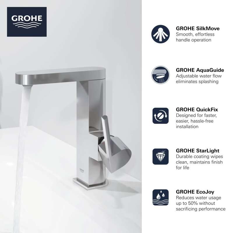 Elegant or minimalist, the GROHE Plus Centerset Bathroom Faucet combines the clean, linear angles of a cube with the gentle curves of a circle making it a distinctive choice no matter the design aesthetic. Engineered to bring comfort and convenience to your bathroom, the Plus Centerset faucet features GROHE SilkMove for smooth, precise handle motion and the durable GROHE StarLight coating for easy care and lasting beauty.