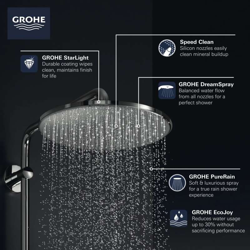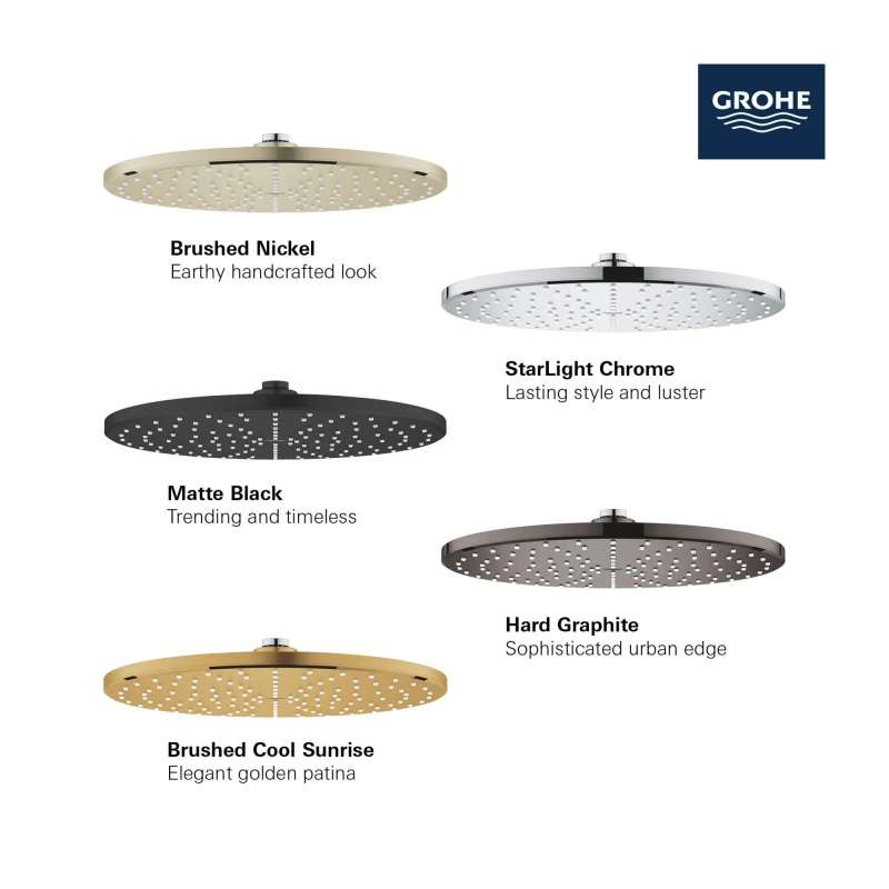The GROHE Rainshower Mono 310 Shower Head offers an exhilarating shower experience thanks to its generous 12" surface and exclusive GROHE DreamSpray technology that ensures a steady, even water flow from every nozzle. Featuring SpeedClean to easily wipe away limescale with your fingertip, the sleek, slim profile of the Rainshower Mono 310 brings contemporary style and superior performance to today's bathroom.
