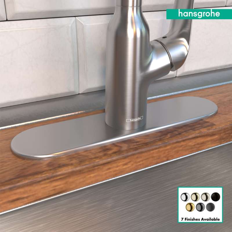The hansgrohe baseplate allows you to install a single-hole faucet in a multi-hole counter setup. It is available in all coordinating finishes to keep your fixtures looking polished.