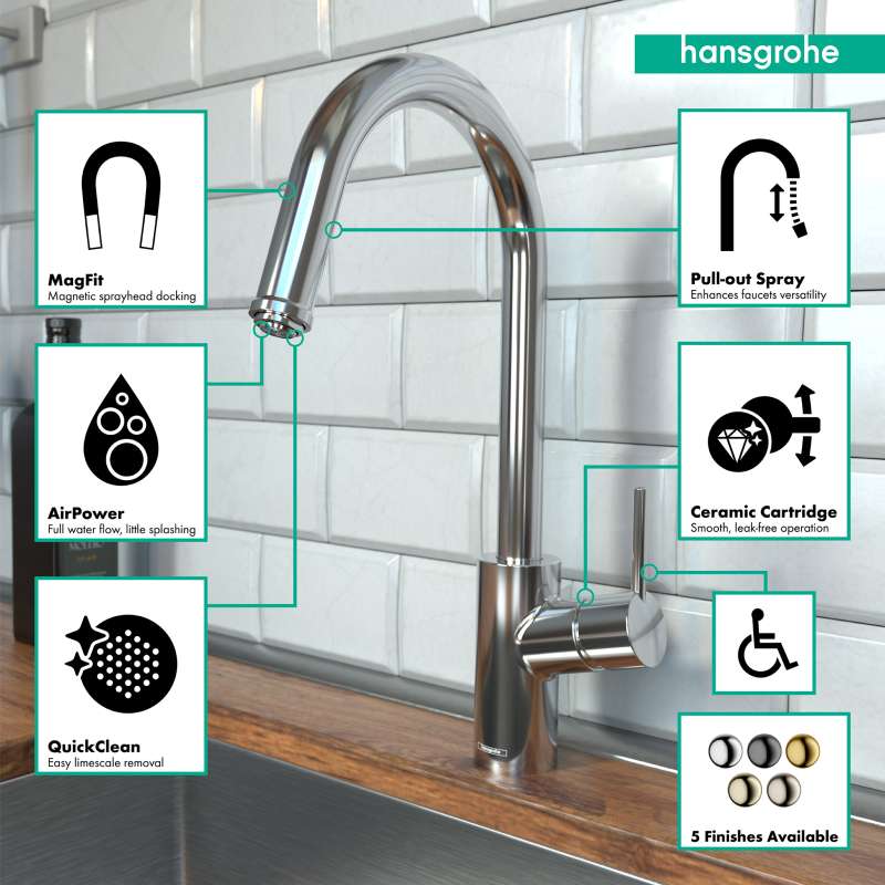 Are you looking for an excellent kitchen helper that combines modern design and many functional details at the sink? The hansgrohe Talis S kitchen faucet range blends in perfectly with any kitchen and is available in different versions - from the basic model right up to faucets with high swivel spouts and hand sprays. Talis faucets are high-quality in form and function. Their conical basic shape gives them an elegant look. And the large areas with their precise transitions are Easy to clean. And if you simply rub the QuickClean silicone inserts on the faucet spout with your finger, limescale has no chance. Your kitchen faucet will be gleaming as good as new in no time. The MagFit magnetic holder fixes the hand spray securely in place on the middle of the spout after use.
