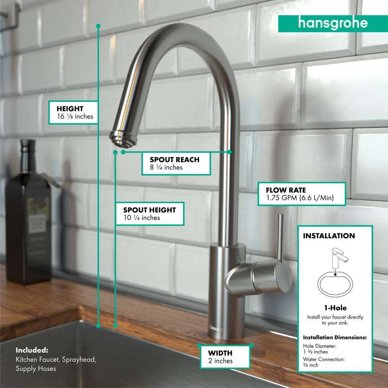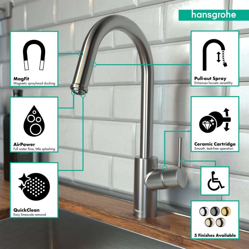 Are you looking for an excellent kitchen helper that combines modern design and many functional details at the sink? The hansgrohe Talis S kitchen faucet range blends in perfectly with any kitchen and is available in different versions - from the basic model right up to faucets with high swivel spouts and hand sprays. Talis faucets are high-quality in form and function. Their conical basic shape gives them an elegant look. And the large areas with their precise transitions are Easy to clean. And if you simply rub the QuickClean silicone inserts on the faucet spout with your finger, limescale has no chance. Your kitchen faucet will be gleaming as good as new in no time. The MagFit magnetic holder fixes the hand spray securely in place on the middle of the spout after use.