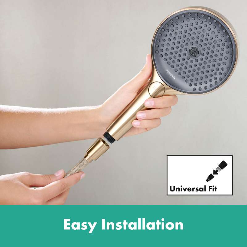 Effortless showering: Designflex textile shower hose from hansgrohe in polished gold optic (63-inch). Experience a completely new showering sensation with the Designflex textile shower hose. Because the world exclusive from hansgrohe is significantly lighter than a comparable hansgrohe shower hose. Designflex consists of multi-colored, braided yarns that offer even more freedom of movement and flexibility. When showering, the cotton-like material pampers you with a pleasantly warm and soft feeling on the skin.The multi-colored textile mesh fascinates with an individual design that perfectly matches the colors of the FinishPlus finishes of hansgrohe showers and mixers. Together, they create a cozy ambience and transform your shower into an oasis of well-being. hansgrohe Designflex - the magic is in the detail. A sense of well-being: The yarns used are made from recycled PET and thus help protect the environment. Known and proven in outdoor and water sports: the high-density braid is waterproof, dirt-repellent and extremely long-lasting. Extra clean: the shower hose is easy to clean and is even dishwasher safe up to 140 degF. Universally suitable: hansgrohe Designflex fits every shower head and every normal water connection (1/2 inch)