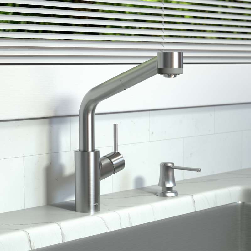 • EXTENDED HOSE RANGE: With the pull-out spout's extended range, 150-degree swivel spout and two spray modes, kitchen tasks have never been so easy
