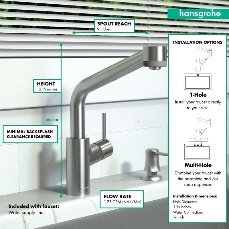 Design With a range of models and styles, paired with the quality and design you expect from hansgrohe, dream kitchens become a reality. Kitchen faucets by hansgrohe exude beautiful design, superior durability, and unique features that are intuitive to use. Pick your desired faucet, then browse the entire product suite for complementary fixtures. German engineering ensures a lifetime of consistent and dependable operation. Maintenance Products that function perfectly are essential. To ensure that they do, every hansgrohe kitchen faucet is 100% air-tested in production. The silicone aerator and spray nozzles help optimize water flow performance, resist mineral deposit build-up, and are designed to be easily wiped clean. Installation Can be installed over existing multi-hole counter configurations. Standard 3/8-inch pipe connection hoses included. Baseplate sold separately. Please comply with all local, state, and federal plumbing codes and regulations. Installation instruction link below. Customer Support customerservice@hansgrohe.com | 1 (800) 334-0455 | Limited Lifetime Warranty | Installation / User Guide / Warranty PDF links below