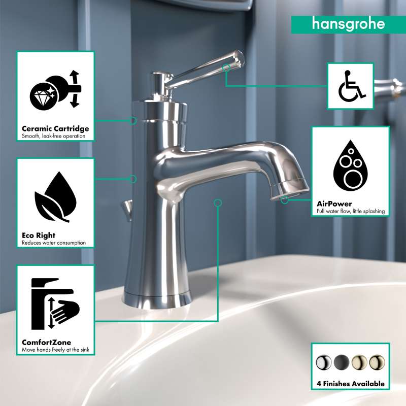 Designed for the moments when you work on the finishing touches, from brushing your teeth to washing your hands, the faucet collection from Joleena includes a range of options for you to choose from. Joleena's transitional styling and balanced design will infuse your routines with elegance. The Joleena single-hole bath faucet features an aerated spray, which provides a luxurious feeling and limits the amount of splashing on your countertop. The single-hole design may be installed in either a 1-hole or 3-hole counter setup with the addition of the Joleena baseplate (04778xxx).
