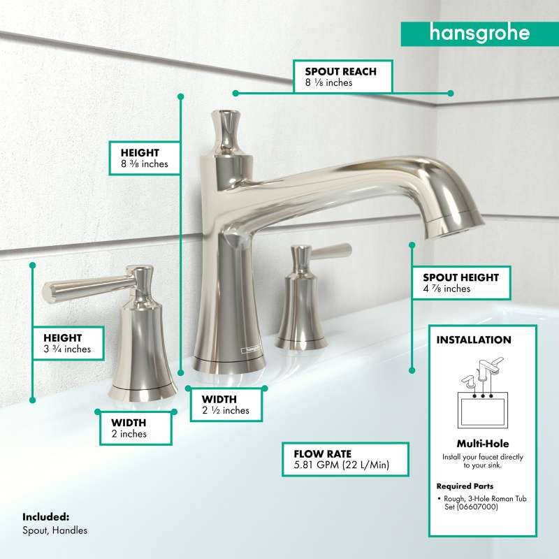 Whether you're starting your day with a shower or winding down with a hot soak, Joleena will elevate the experience and seamlessly weave it in with the rest of your day. The Joleena 3-Hole Tub Filler perfectly coordinates with the entire Joleena bath and shower collection. It requires the hansgrohe Rough for 3-Hole Roman Tub Sets (06607000) for installation in your bathroom. Transform your bathroom into a cleaner and more polished part of your home with the Joleena Collection by hansgrohe.