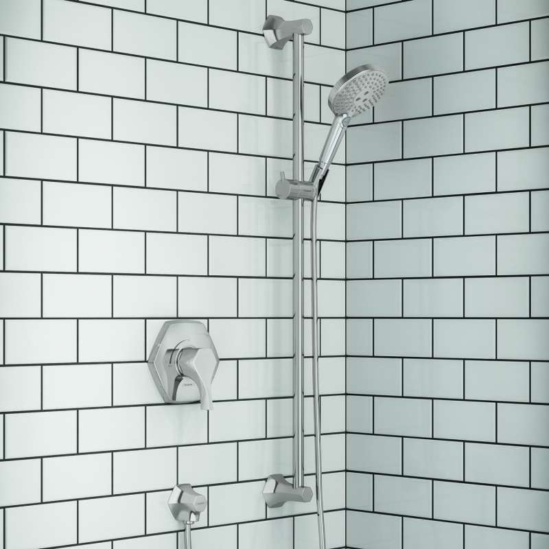 Inspired by the Art Deco movement and the 1920s, Locarno is the revival of iconic sophistication and elegance. Geometric octagonal form recalls the monumental period and will make a bold statement of authenticity and artistic appreciation in any living space. Available in five different finishes, Locarno will enable endless creativity, opening the door for uniquely glamorous interior spaces. The Locarno 36-inch wallbar is a perfect solution for multiple users. The sliding handshower holder allows you to easily move the shower to the correct height, but also allows you to use the handshower freely to clean the shower or wash a pet.