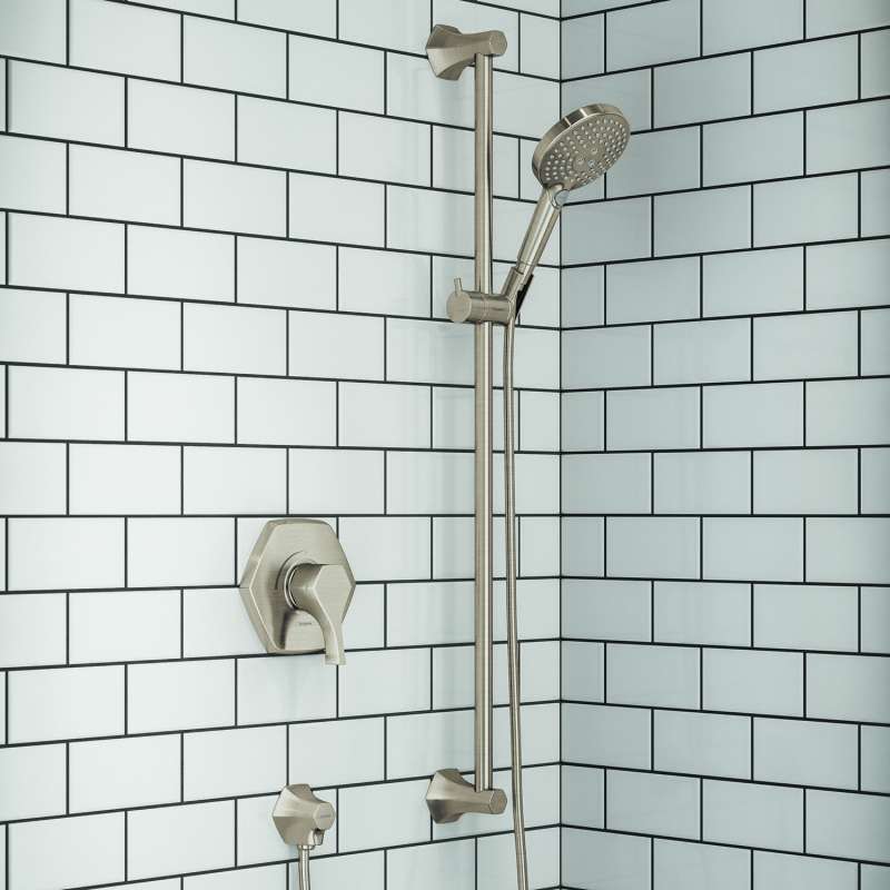 Inspired by the Art Deco movement and the 1920s, Locarno is the revival of iconic sophistication and elegance. Geometric octagonal form recalls the monumental period and will make a bold statement of authenticity and artistic appreciation in any living space. Available in five different finishes, Locarno will enable endless creativity, opening the door for uniquely glamorous interior spaces. The Locarno 36-inch wallbar is a perfect solution for multiple users. The sliding handshower holder allows you to easily move the shower to the correct height, but also allows you to use the handshower freely to clean the shower or wash a pet.