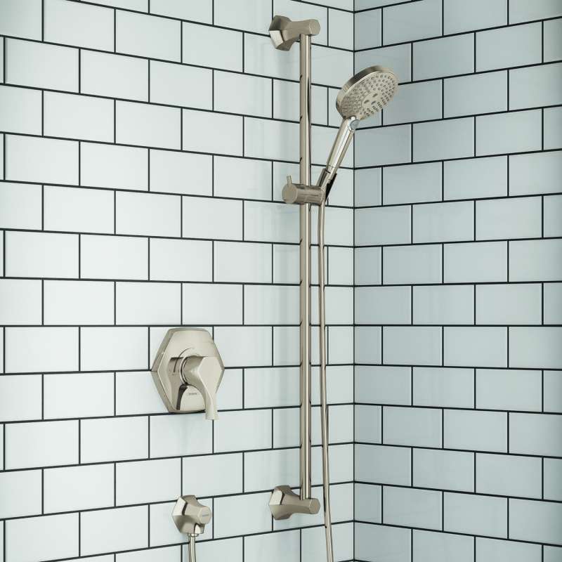 Inspired by the Art Deco movement and the 1920s, Locarno is the revival of iconic sophistication and elegance. Geometric octagonal form recalls the monumental period and will make a bold statement of authenticity and artistic appreciation in any living space. Available in five different finishes, Locarno will enable endless creativity, opening the door for uniquely glamorous interior spaces. The Locarno 36-inch wallbar is a perfect solution for multiple users. The sliding handshower holder allows you to easily move the shower to the correct height, but also allows you to use the handshower freely to clean the shower or wash a pet.