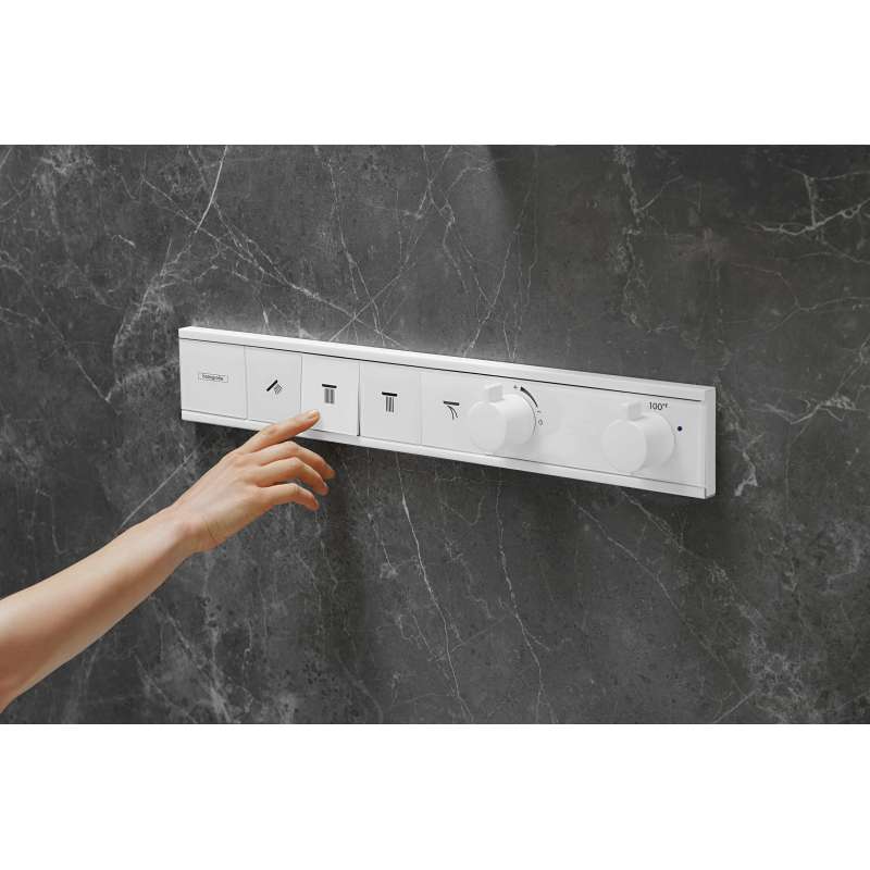 The RainSelect concealed thermostatic mixer with 4 functions provides a user-friendly shower system. Large soft-click buttons with wear-resistant symbols divert the water between a handshower (sold separately) and the included showerhead. The easy to use knobs allow you to easily adjust your water volume and temperature. The high-quality chrome-plated finish is long-lasting and easy to clean. The shut-off function helps to stop water flow when pressure is placed on the Select buttons, adding an extra layer of security. The hansgrohe shower thermostat allows you to set your desired water temperature, protecting you from excessively hot or cold water. An extra safety lock only releases hot water once a button is pressed (SafetyStop). The elegant, concealed installation of the hansgrohe RainSelect shower thermostat creates space for care-free, unobstructed showering. This shower set requires the Rainfinity Rough set (Part No. 04865180) for installation.