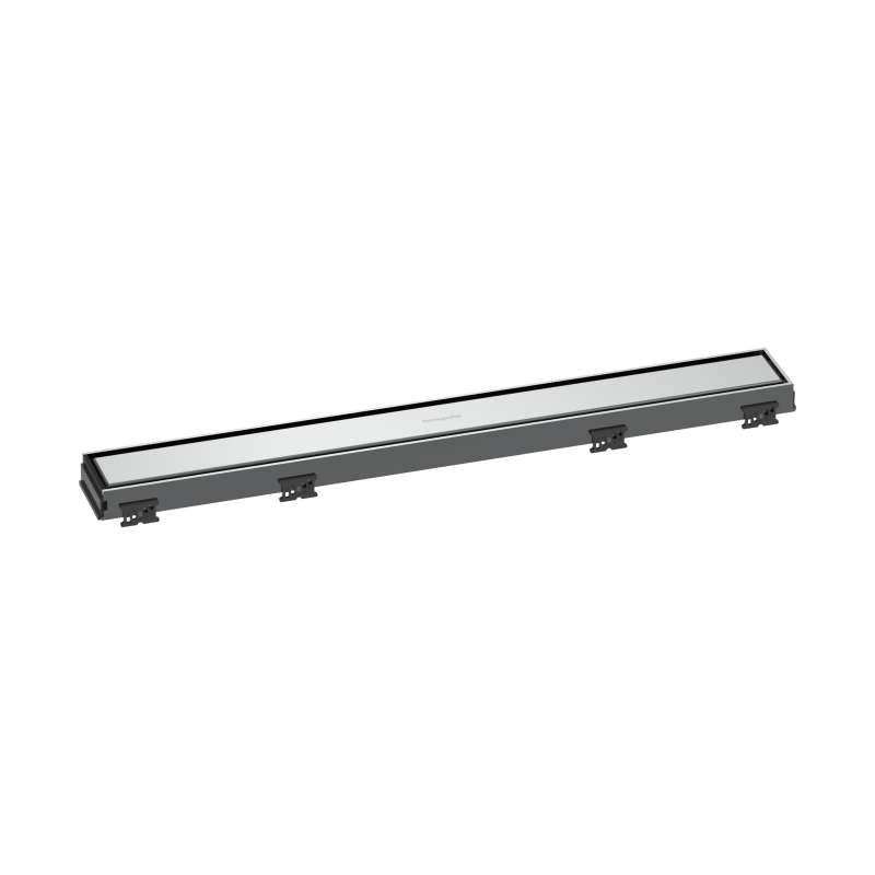 The RainDrain Match 23 5/8" drain trim (finish set) in chrome from hansgrohe is a flexible drainage solution for installation flush with the back wall or freestanding in the shower area. With its chrome surface finish, the drain trim is suitable for modern as well as classic bathroom designs. Alternatively, the channel can be tiled at the back also (max. tile thickness 18 mm). The vertically adjustable frame offers flexibility in the drain barrier also: so the system can be adjusted to the height of the tiles - for floor-level installation without trip hazard. The result meets the requirements of a barrier-free shower area. The innovative high-tech silicone membrane also ensure that hair and dirt do not get stuck. This helps prevent annoying blockages in the drain. It is easy: They are installed on a complete set with pre-assembled sealing fleece (sold separately).