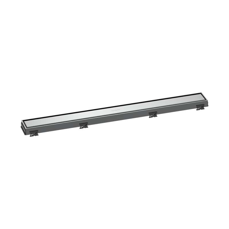 The RainDrain Match 27 5/8" drain trim (finish set) in chrome from hansgrohe is a flexible drainage solution for installation flush with the back wall or freestanding in the shower area. With its chrome surface finish, the drain trim is suitable for modern as well as classic bathroom designs. Alternatively, the channel can be tiled at the back also (max. tile thickness 18 mm). The vertically adjustable frame offers flexibility in the drain barrier also: so the system can be adjusted to the height of the tiles - for floor-level installation without trip hazard. The result meets the requirements of a barrier-free shower area. The innovative high-tech silicone membrane also ensure that hair and dirt do not get stuck. This helps prevent annoying blockages in the drain. It is easy: They are installed on a complete set with pre-assembled sealing fleece (sold separately).