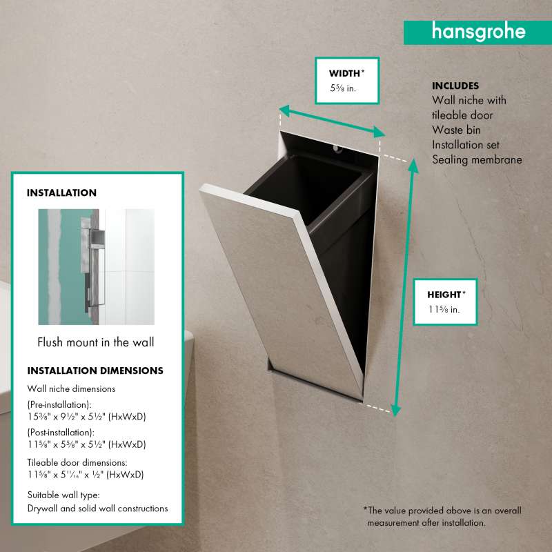 • Hansgrohe Xtrastoris Rock Recessed Trash Bin With Shelf & Tileable Door In Brushed Stainless Steel, 56063800 Brushed Stainless Steel