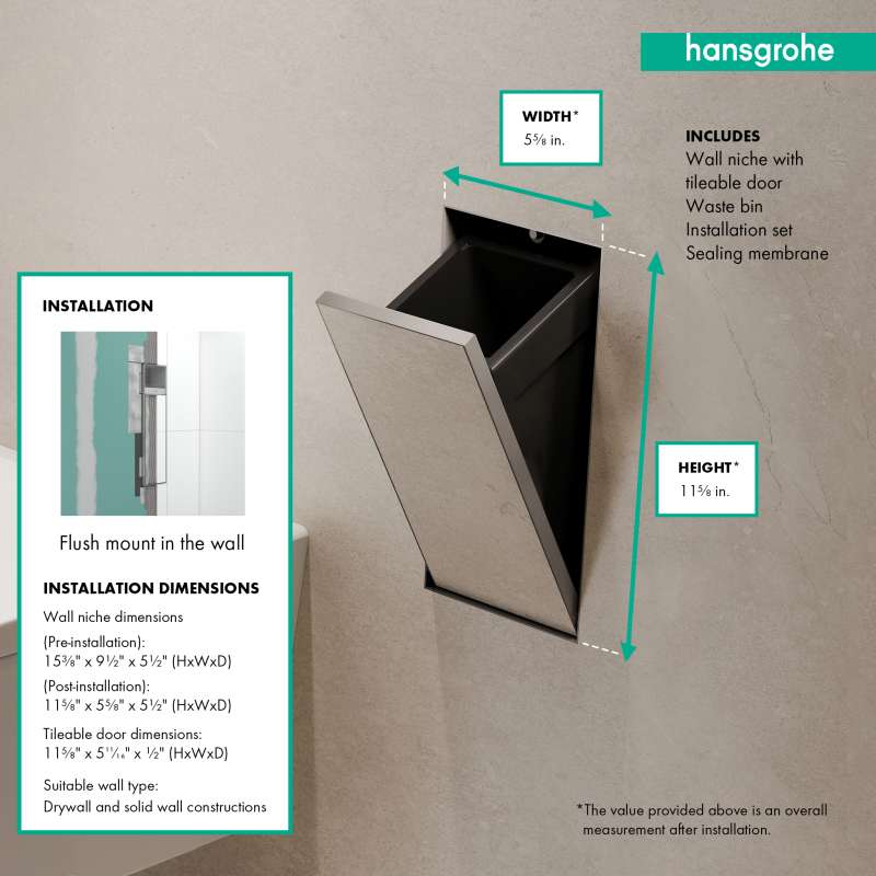 Elevate your bathroom with the hansgrohe XtraStoris Rock Recessed Trash Bin with Shelf & Tileable Door in Brushed Stainless Steel, boasting a sleek and functional frameless design. This innovative trash bin discreetly conceals waste while offering a convenient shelf and tileable door for seamless integration into your bathroom decor. The brushed stainless steel finish adds a touch of modern sophistication while being easy to clean and maintain. Designed for durability and moisture resistance, it includes an easy-to-install waterproof kit, making it a hassle-free addition to your bathroom. Upgrade your space with the hansgrohe XtraStoris Rock collection for a perfect blend of style and functionality.
