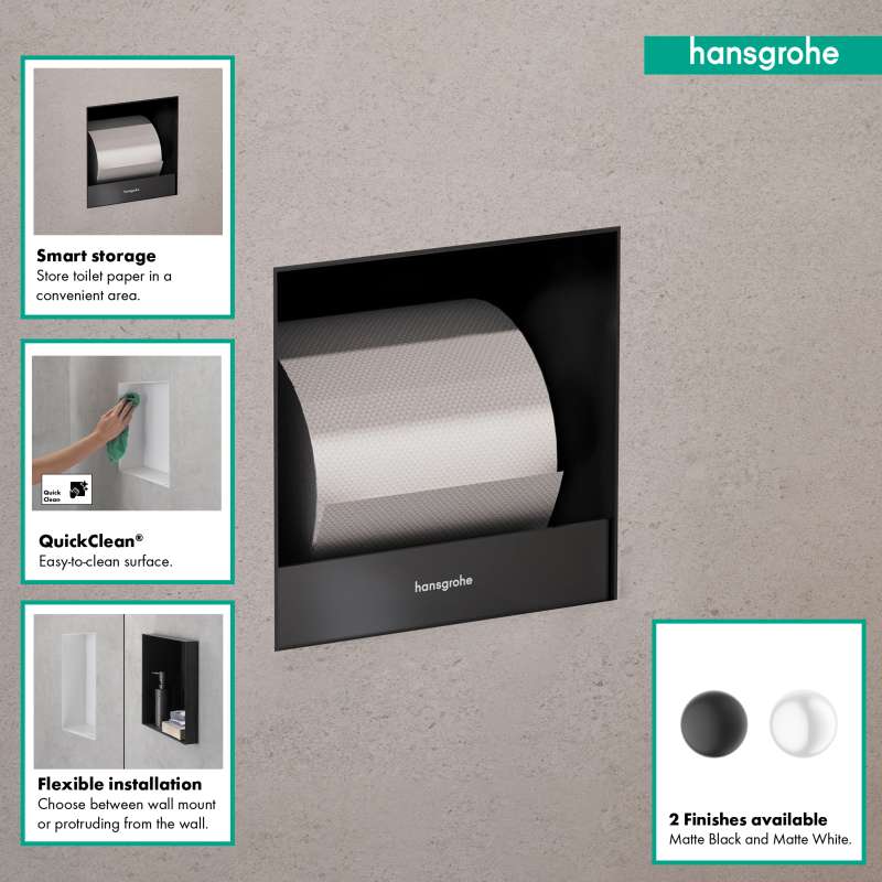 Perfectly integrated: Recessed wall niche in matte black as toilet paper holder from hansgrohe The XtraStoris Original built-in toilet paper holder in matte black from hansgrohe is the elegant solution for a harmoniously designed bathroom. Almost invisible recessed into the wall, the frameless shelf provides a tidy and quiet area around the bathroom. Thanks to its sophisticated design, the reduced wall niche (6 x 6 x 5.5 in - H x W x D) provides a secure hold for the toilet paper roll, which lies loosely on the shelf. It can therefore be changed easily and quickly. With its matte black stainless steel body, the wall niche is a modern eye-catcher in any bathroom ambience. The matte black body matches the color of hansgrohe faucets in matte black. The matte black finish is easy to clean and stays beautiful.