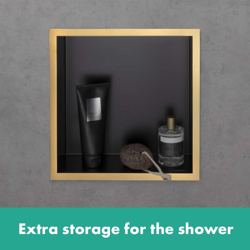 Shelf as a design highlight: hansgrohe XtraStoris individual wall niche (12 x 12 x 4 in) with polished gold optic-colored frame. The XtraStoris individual wall niche 12 x 12 x 4 in with designer frame in brushed stainless steel from hansgrohe is more than just a highly functional shelf for the shower area. In fact, the brushed stainless steel body in combination with the polished gold optic-colored frame will transform your wall niche into an absolute design highlight in a modern bathroom setting. The shelf solution for showers or bathrooms is perfectly matched to hansgrohe FinishPlus products and blends in seamlessly with the room design. The result? An exclusive, seamless bathroom design. With a size of 12 x 12 x 4 in, the shelf offers extra storage space for personal care products. At the same time, the wall-integrated installation ensures more elbow room in the shower. Included in the box is the brushed stainless steel body and a water-tight installation set especially designed for the wet area, including sealing fleece. This makes it easy to install and safe to use. Quality from hansgrohe: The surface of the body and frame is easy to clean and retains its beauty for longer.