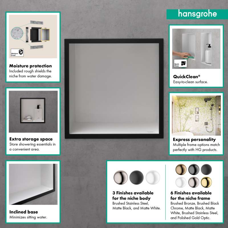 Shelf as a design highlight: hansgrohe XtraStoris individual wall niche (12 x 12 x 4 in) with matte white-colored frame. The XtraStoris individual wall niche 12 x 12 x 4 in with designer frame in matte white from hansgrohe is more than just a highly functional shelf for the shower area. In fact, the brushed stainless steel body in combination with the matte white-colored frame will transform your wall niche into an absolute design highlight in a modern bathroom setting. The shelf solution for showers or bathrooms is perfectly matched to hansgrohe FinishPlus products and blends in seamlessly with the room design. The result? An exclusive, seamless bathroom design. With a size of 12 x 12 x 4 in, the shelf offers extra storage space for personal care products. At the same time, the wall-integrated installation ensures more elbow room in the shower. Included in the box is the brushed stainless steel body and a water-tight installation set especially designed for the wet area, including sealing fleece. This makes it easy to install and safe to use. Quality from hansgrohe: The surface of the body and frame is easy to clean and retains its beauty for longer.