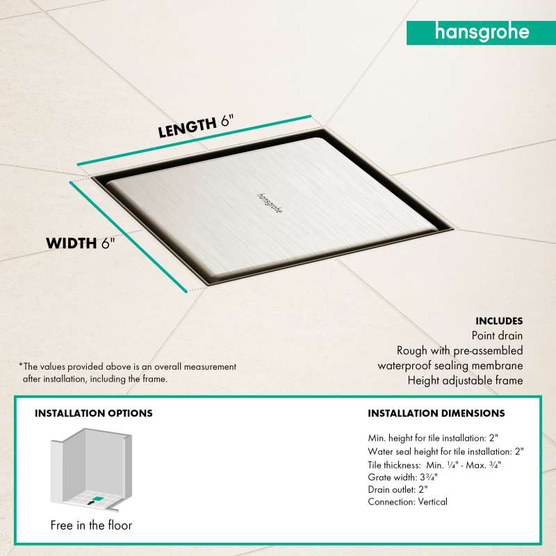 • Hansgrohe Raindrain Brilliance Point Drain Set 6"X 6" Trim Tileable Rear Cover And Rough In Brushed Stainless Steel, 56134801 Brushed Stainless Steel