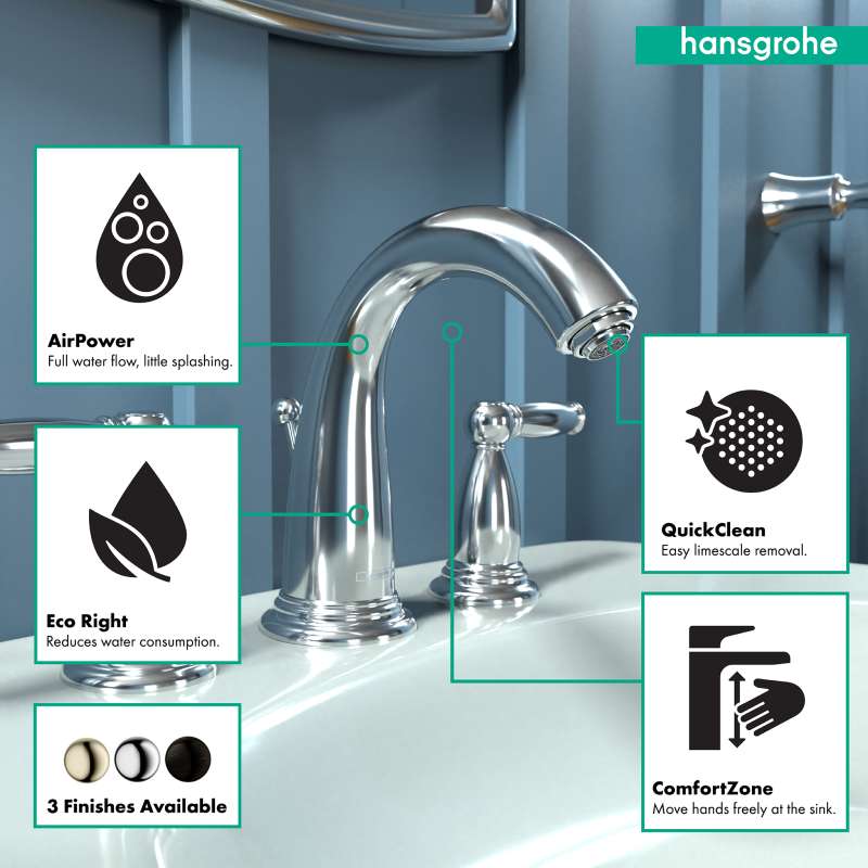 Design With a range of models and styles, paired with the quality and design you expect from hansgrohe, dream bathrooms become a reality. Bath faucets by hansgrohe exude beautiful design with superior performance and durability. Pick your desired faucet, then browse the entire product suite for complementary accessories. German engineering ensures a lifetime of consistent and dependable operation. Maintenance Products that function perfectly are essential. To ensure that they do, every hansgrohe product 100% air tested in production. hansgrohe faucets feature a silicone aerator that optimizes water flow performance, resists mineral deposit build-up, and is designed to be easily wiped clean. Installation Can be installed in existing 1 or 3 hole counter configurations. Standard 3/8-inch pipe connection hoses included (attached). Baseplate sold separately. Please comply with all local, state, and federal plumbing codes and regulations. Installation instruction link below. Customer Support customerservice@hansgrohe.com | 1 (800) 334-0455 | Limited Lifetime Warranty | Installation / User Guide / Warranty PDF links below