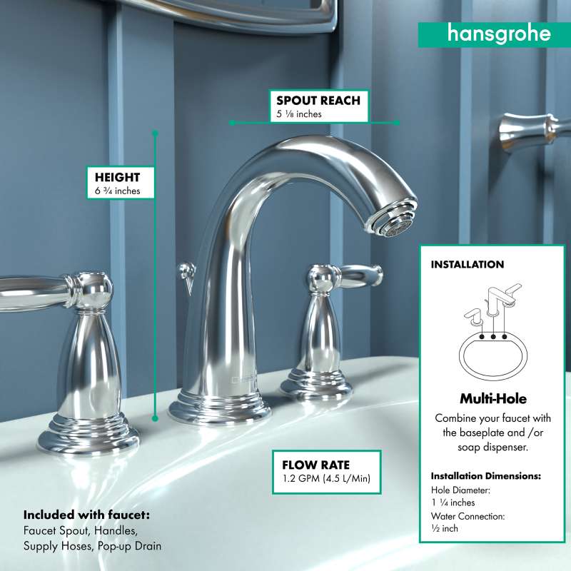 • Hansgrohe Swing C Widespread Faucet With Pop-Up Drain, 1.2 Gpm In Chrome, 6117000 Chrome