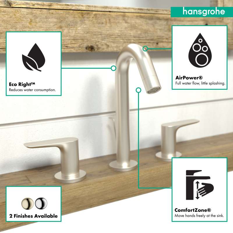 Clear lines and finely curved surfaces make Logis a real eye-catcher. The generous surfaces exude quality and make cleaning child's play. A striking feature of Logis: the ergonomically designed handle with a rounded shape . It invites you to touch and operate it. Logis fixtures are equipped with EcoRight technology to ensure that not only the purchase but also the operation costs are reduced. This protects the environment and your wallet. Hansgrohe AirPower also ensures responsible use of water resources . This mixes air into the water, increasing its efficiency and also your water enjoyment. Transform the space between the spout and the sink into your ComfortZone. Logis bathroom faucets are available in different heights so that you can adjust them perfectly to your sink. This avoids splashes and gives you room to move.