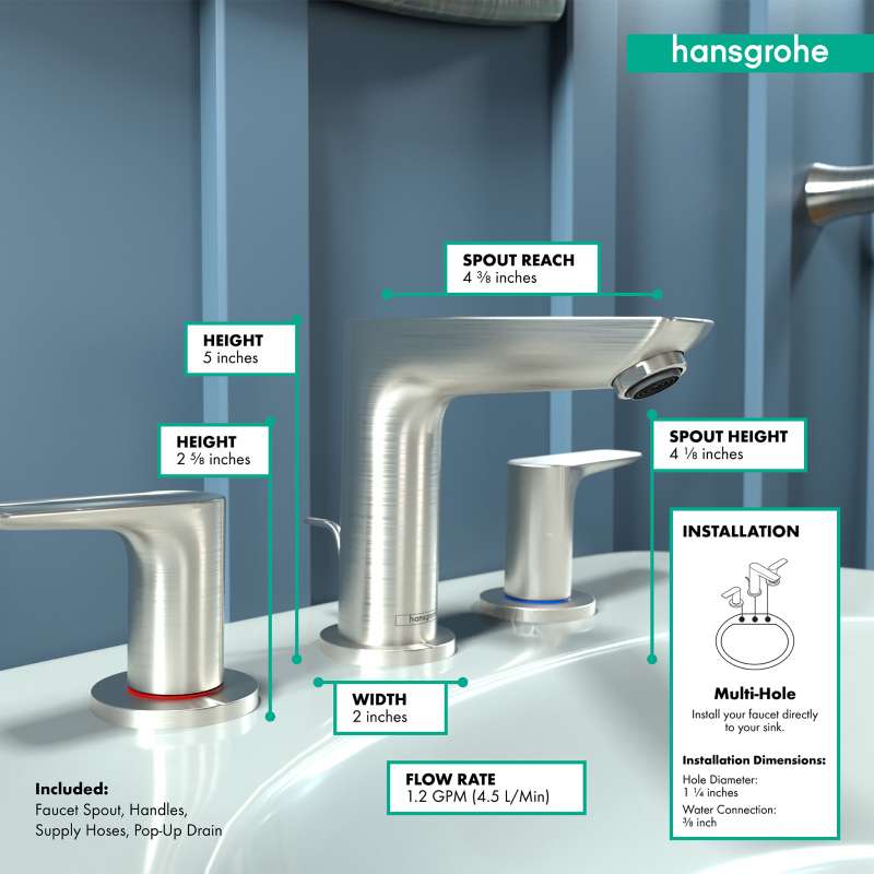 The gently tapered base body of the Talis E bathroom collection flows into a graceful spout with an opulent surface. Precise edges line the spout and lever. Whether you choose a single-lever faucet with ComfortZone or a wall-mounted option: Talis E exudes quality. The floating surfaces are elegantly extended onto the bath and shower. Here, too, hansgrohe offers you Select: Talis Select E bathroom faucets can be operated with your finger, arm or elbow as desired. The Select feature the operating revolution on the bathroom faucet where you can conveniently switch the Water flow on and off at the touch of a button. And the ComfortZone option offers you various spout heights to match your bathroom sink. Talis E is available in a total of 6 finishes with which you can create effective designs or pick up the style throughout the bathroom. The trendy colors and surface designs underline your personal taste without compromising on the timeless design.