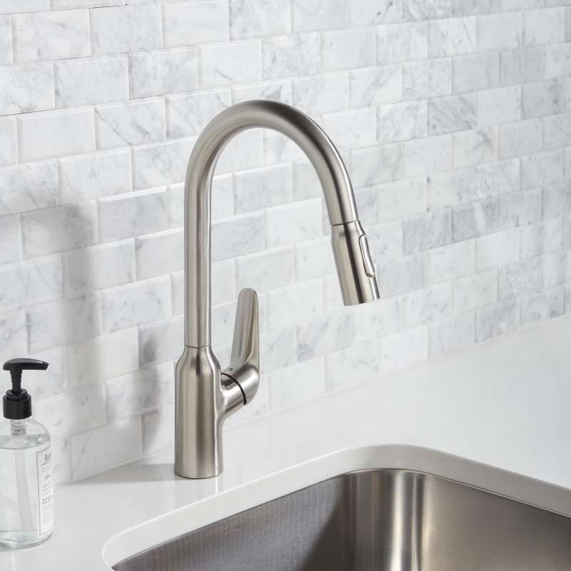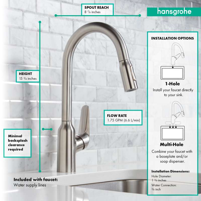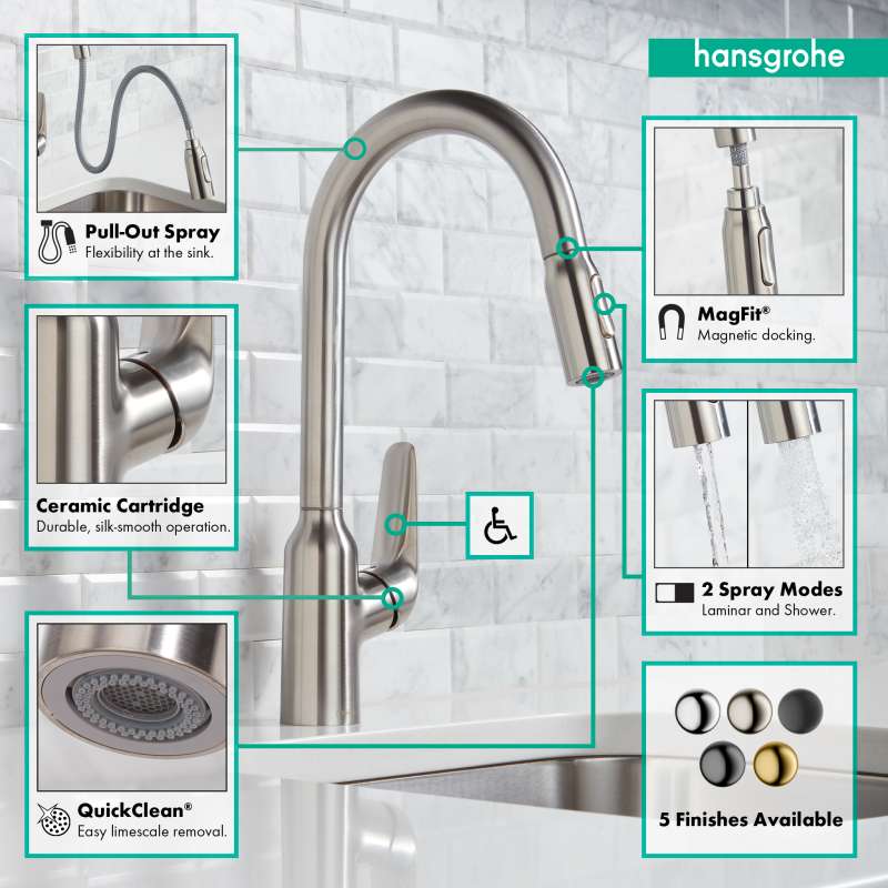 Timeless design and quality in your kitchen with the Focus N modern design that blends harmoniously into any kitchen. The large handle design offers great ease of use and can also be operated safely with soapy hands. Thanks to the high-quality mounting components, the Installation of your new faucet is simple and safe. The tested connection hoses are flexible and temperature-resistant. QuickClean technology cleans the kitchen faucet quickly and MagFit keeps the hand spray safe and secure in the faucet spout. Backed by a limited lifetime warranty for piece of mind.